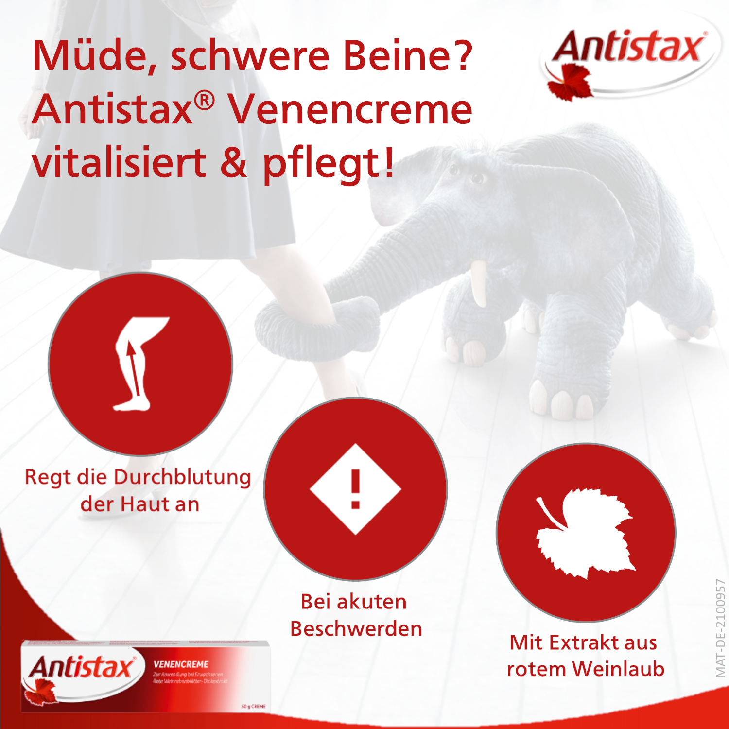 Antistax® Venencreme mit rotem Weinlaub-Extrakt lindert Beschwerden und Schweregefühl der Beine im Zusammenhang mit leichten venösen Durchblutungsstörungen.