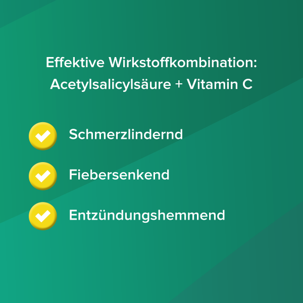 Das Arzneimittel besteht aus einer Wirkstoffkombination. Der Wirkstoff Acetylsalicylsäure wirkt schmerzstillend, fiebersenkend und entzündungshemmend zugleich. Er blockiert die Bildung bestimmter Botenstoffe im Körper, so genannte Prostaglandine. Diese sind an der Entstehung von Schmerzen, Fieber und Entzündungen wesentlich beteiligt.