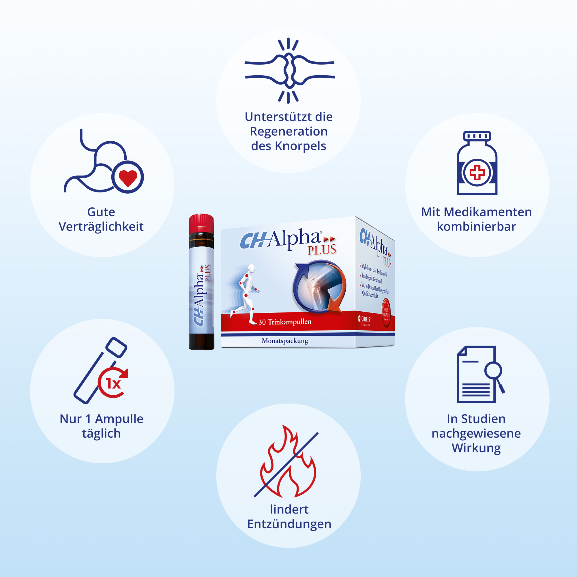 - GEZIELTE VERSORGUNG DER GELENKKNORPEL: Die speziellen Kollagen-Peptide in CH-Alpha® PLUS wirken gezielt in den Kollagenstrukturen der Gelenke und Bandscheiben und können besonders gut vom Körper aufgenommen werden.