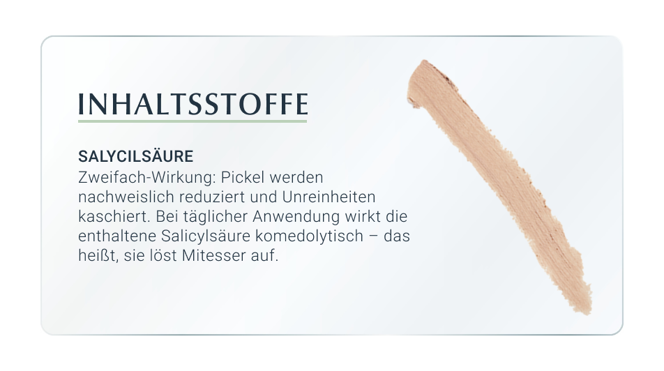Auch begleitend während einer medizinischen Aknetherapie und auch während einer Schwangerschaft kann der Abdeckstift mit Salicylsäure verwendet werden.