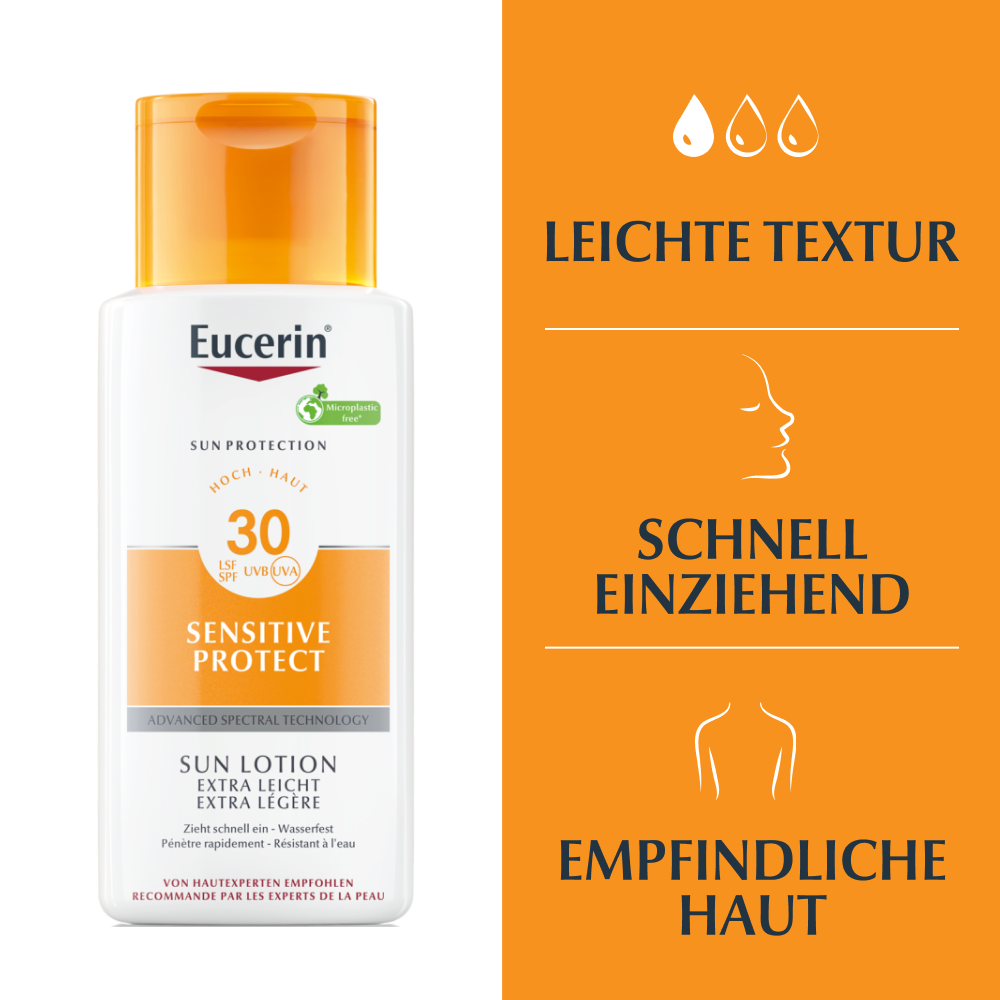 Neben UV-Strahlung kann auch das hochenergetische sichtbare Licht (HEV-Licht) die Haut beschädigen. Um dies zu verhindern und die Haut effektiv zu schützen, ist die Eucerin Sensitive Protect Body Sun Lotion Extra Light LSF 30 mit der Advanced Spectral Technology ausgestattet. In dieser Technologie kombiniert die Sonnencreme UVA/UVB-Filter mit Licochalcone A zur Neutralisation freier Radikale, die durch UV- und HEV-Licht ausgelöst werden. Zudem unterstützt Glycyrrhetinsäure den natürlichen Heilungsprozess der DNA.