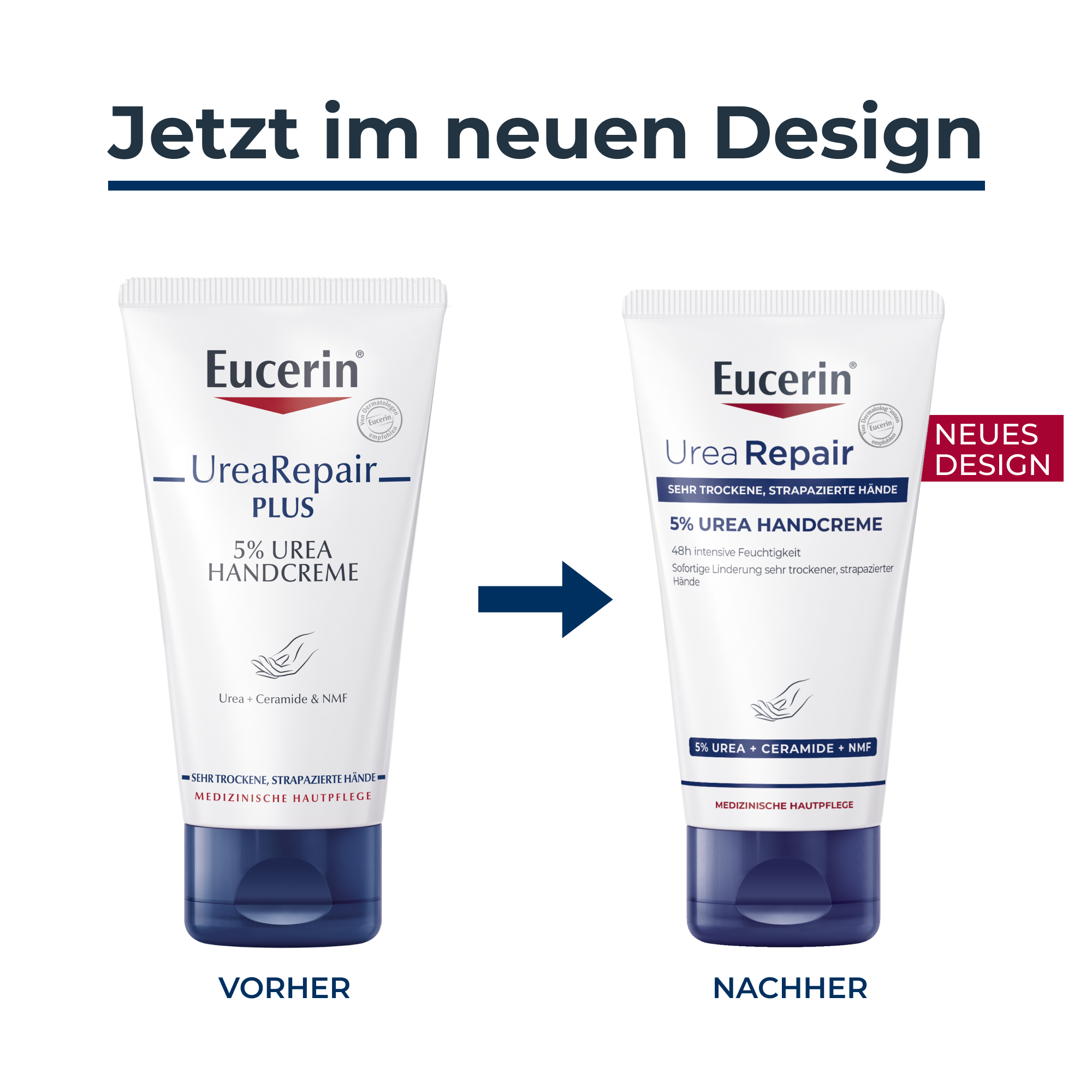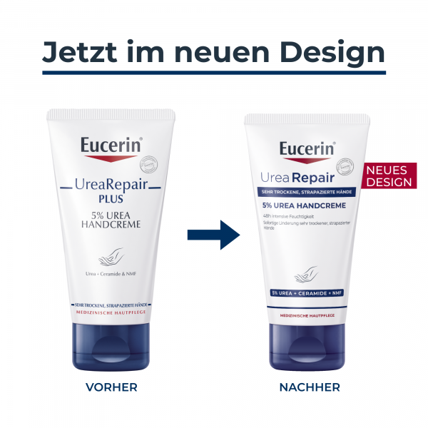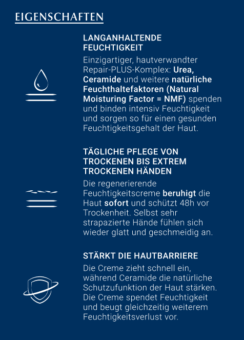 Oft sind die Hände äußeren Faktoren wie kaltem Wetter, Wasser, Seife und anderen Chemikalien ausgesetzt und die Haut ist wesentlich anfälliger für Trockenheit, Rötungen und Irritationen. Der Repair-PLUS-Komplex der Handpflege verbessert die Feuchtigkeitsbindung der Haut und bringt den Lipid-(Fett-) und Feuchtigkeitshaushalt wieder in ein natürliches Gleichgewicht. Dies wird durch die Kombination der Wirkstoffe Urea, Ceramide sowie durch natürliche Feuchthaltefaktoren erreicht.