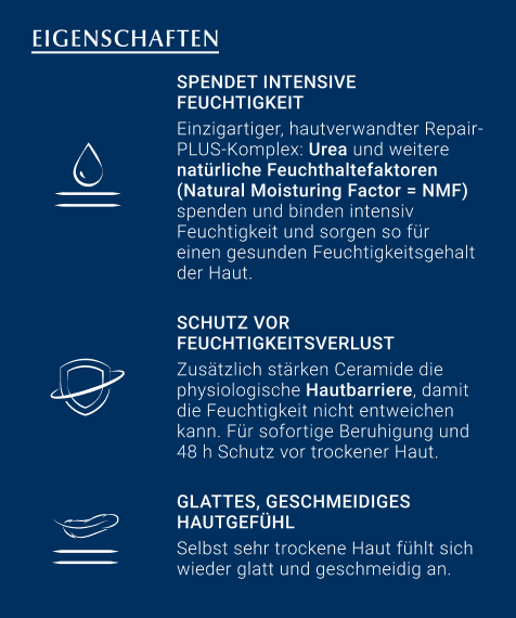 Der Repair-PLUS-Komplex in der Körpercreme verbessert die Feuchtigkeitsbindung der Haut und so wird der Feuchtigkeitsgehalt in den oberen Hautschichten deutlich erhöht. Dies wird durch die Kombination des Wirkstoffs Urea mit natürlichen Feuchthaltefaktoren erreicht. Zugleich stärken Ceramide die hauteigene Barriere, schützen und pflegen intensiv. Spannungsgefühl, Juckreiz oder eine raue Oberfläche werden sofort gelindert. Dafür bleibt ein glattes und geschmeidiges Hautgefühl.