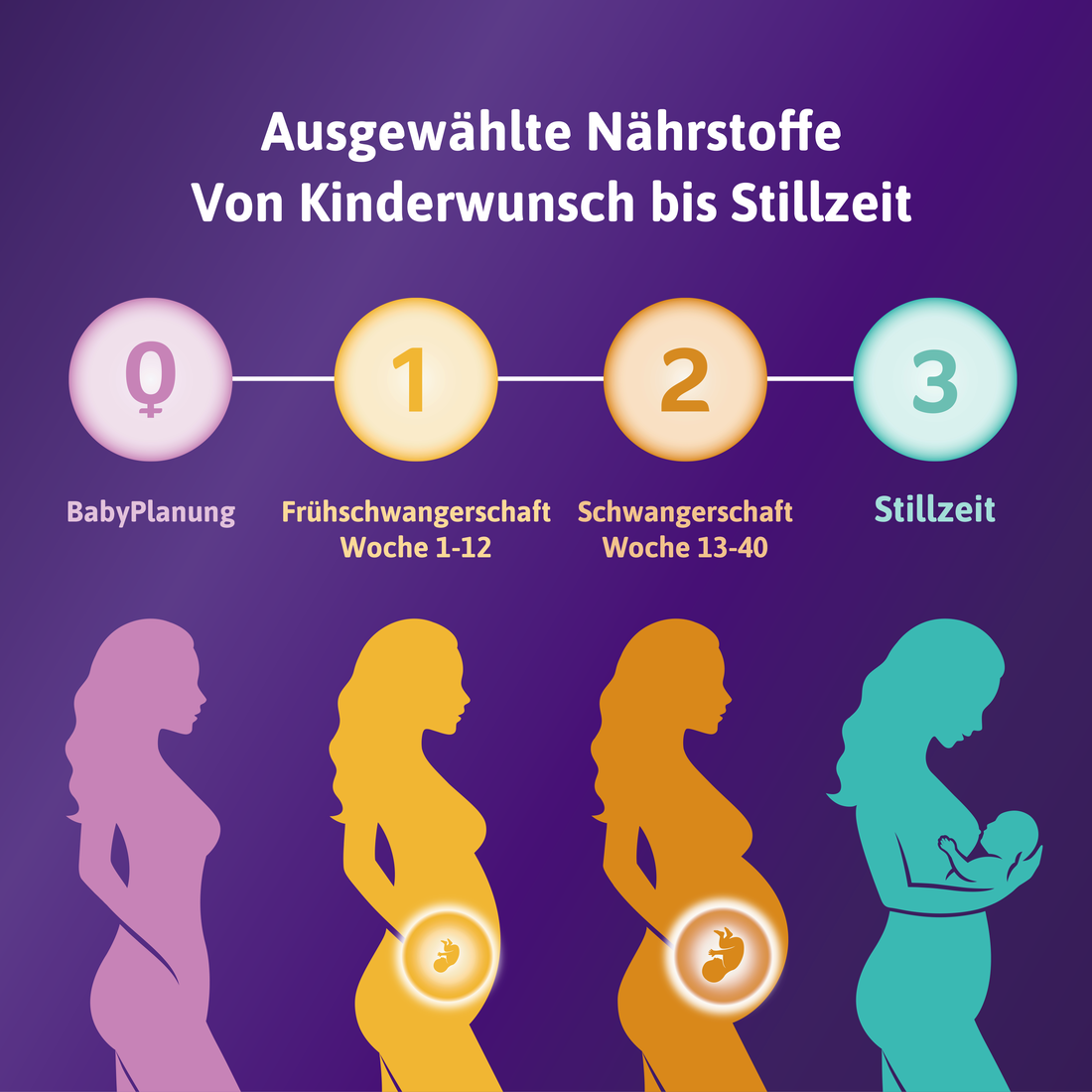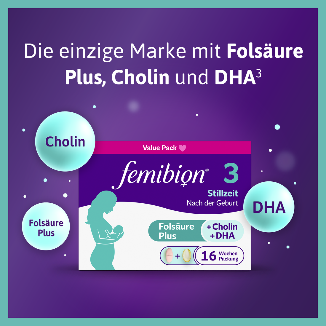 Femibion® 3 Stillzeit versorgt mit speziell ausgewählten Nährstoffen, als Ergänzung zu einer abwechslungsreichen Ernährung. Dazu gehören u.a. Folat (Folsäure & Metafolin®), die Omega-3-Fettsäure DHA, Cholin und Vitamin A, das zur Erhaltung normaler Sehkraft und zur normalen Funktion des Immunsystems beiträgt. Auch Calcium, das die normale Muskel- und Knochenfunktion unterstützt und das Carotinoid Lutein sind in Femibion® 3 Stillzeit enthalten.