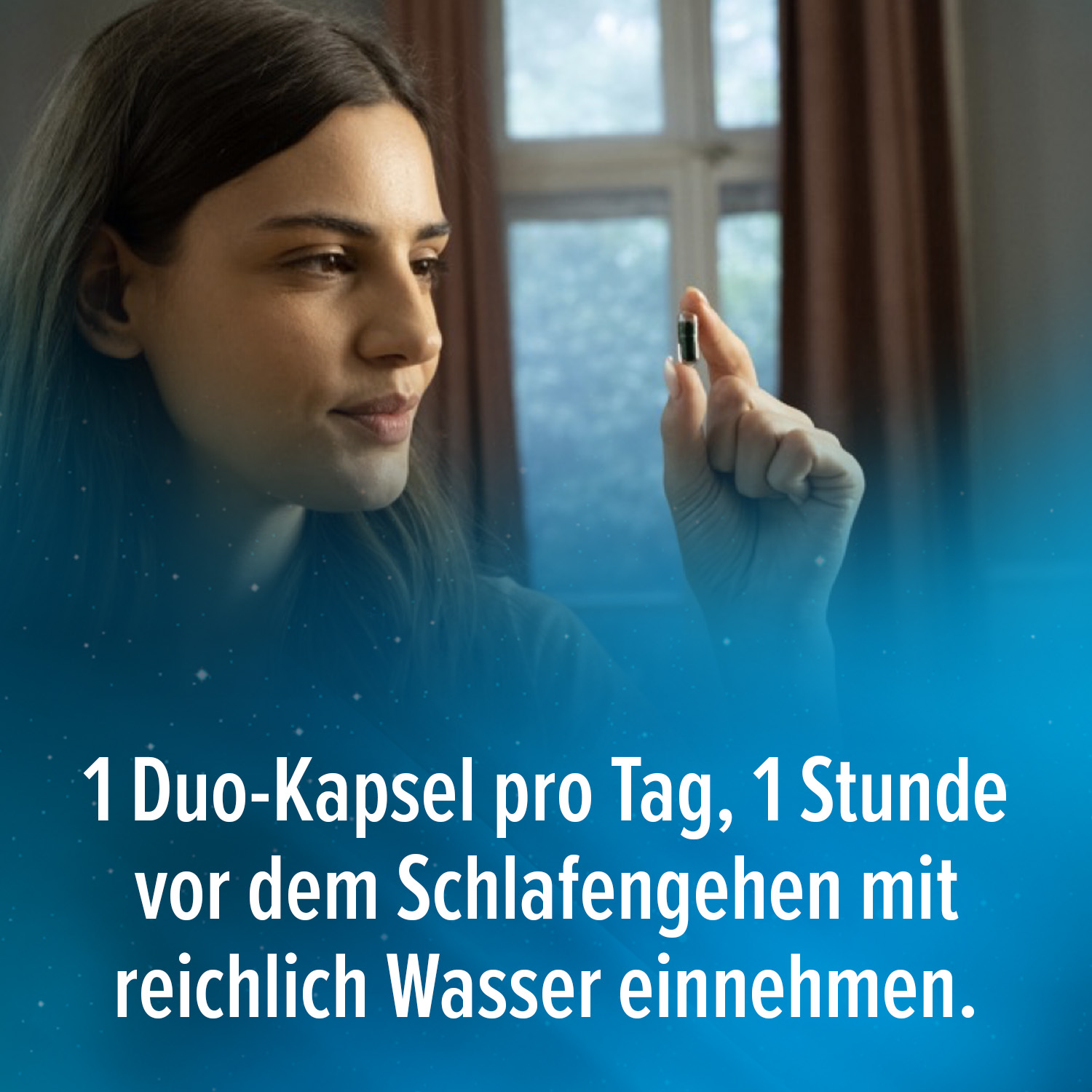 Die innovative 2-Phasen-Kapsel sorgt mit gezielter Freisetzung für ein entspannteres Einschlafen. Diese Technologie ermöglicht es, trockene und flüssige Inhaltsstoffe zu kombinieren und die Freisetzung dieser Inhaltsstoffe zu verzögern.