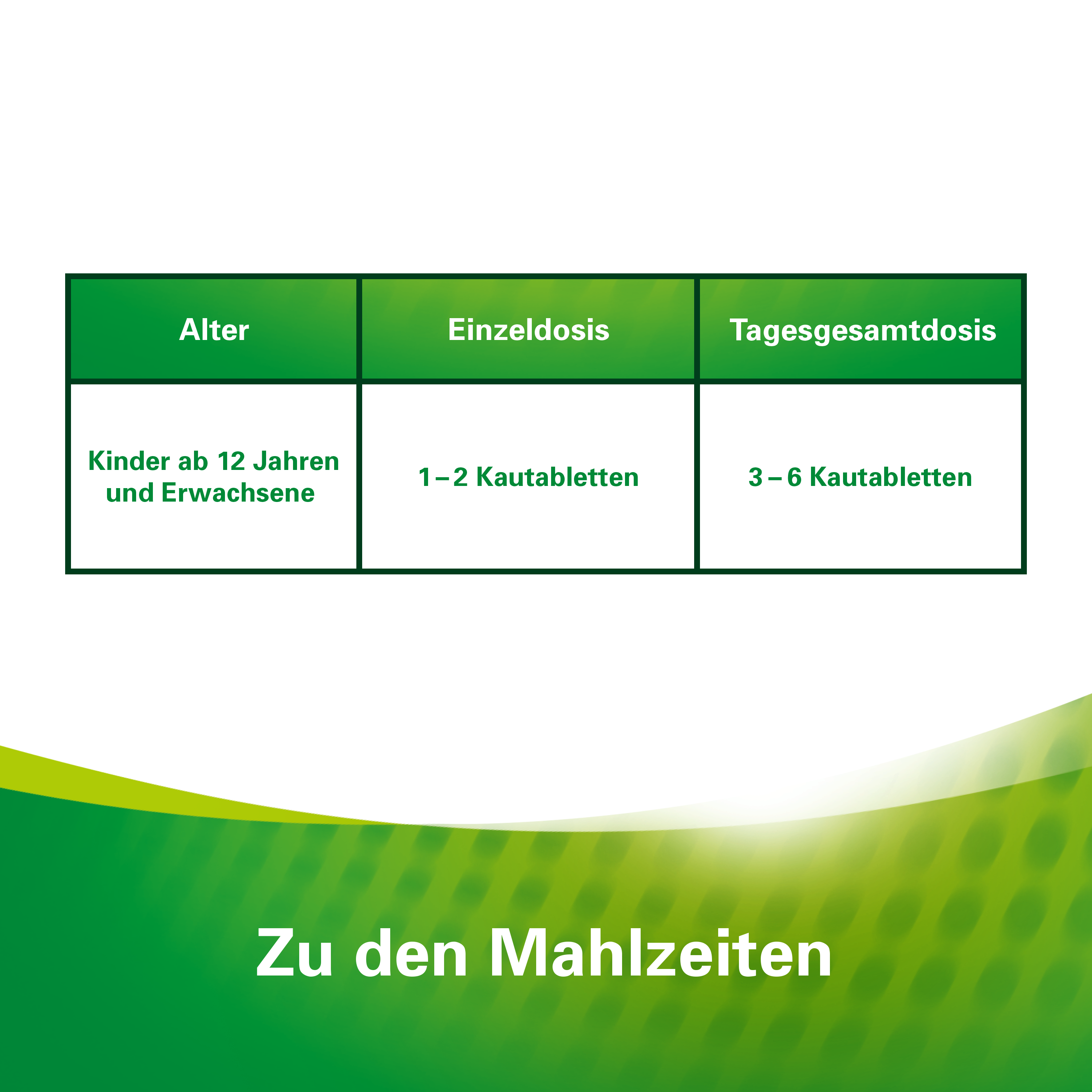 | Jugendliche ab 12 Jahren und Erwachsene | 1-2 Tabletten | 3-mal täglich | zu der Mahlzeit |