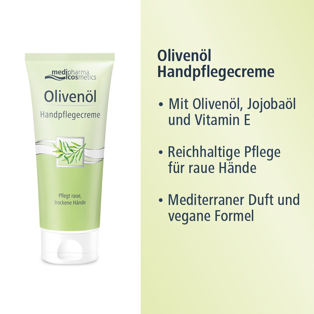 Die Olivenöl Handpflegecreme von medipharma cosmetics wurde für die speziellen Pflegebedürfnisse von rauen, trockenen Händen entwickelt. Sie enthält kaltgepresstes Olivenöl und hautpflegendes Jojobaöl, welche die Haut vor dem Austrocknen schützen und sie zart und geschmeidig pflegen. Die Hände fühlen nach der Anwendung zart und gepflegt an. Zurück bleibt ein geschmeidiges Hautgefühl und der mediterrane Duft unserer beliebten Olivenöl Pflegeserie.