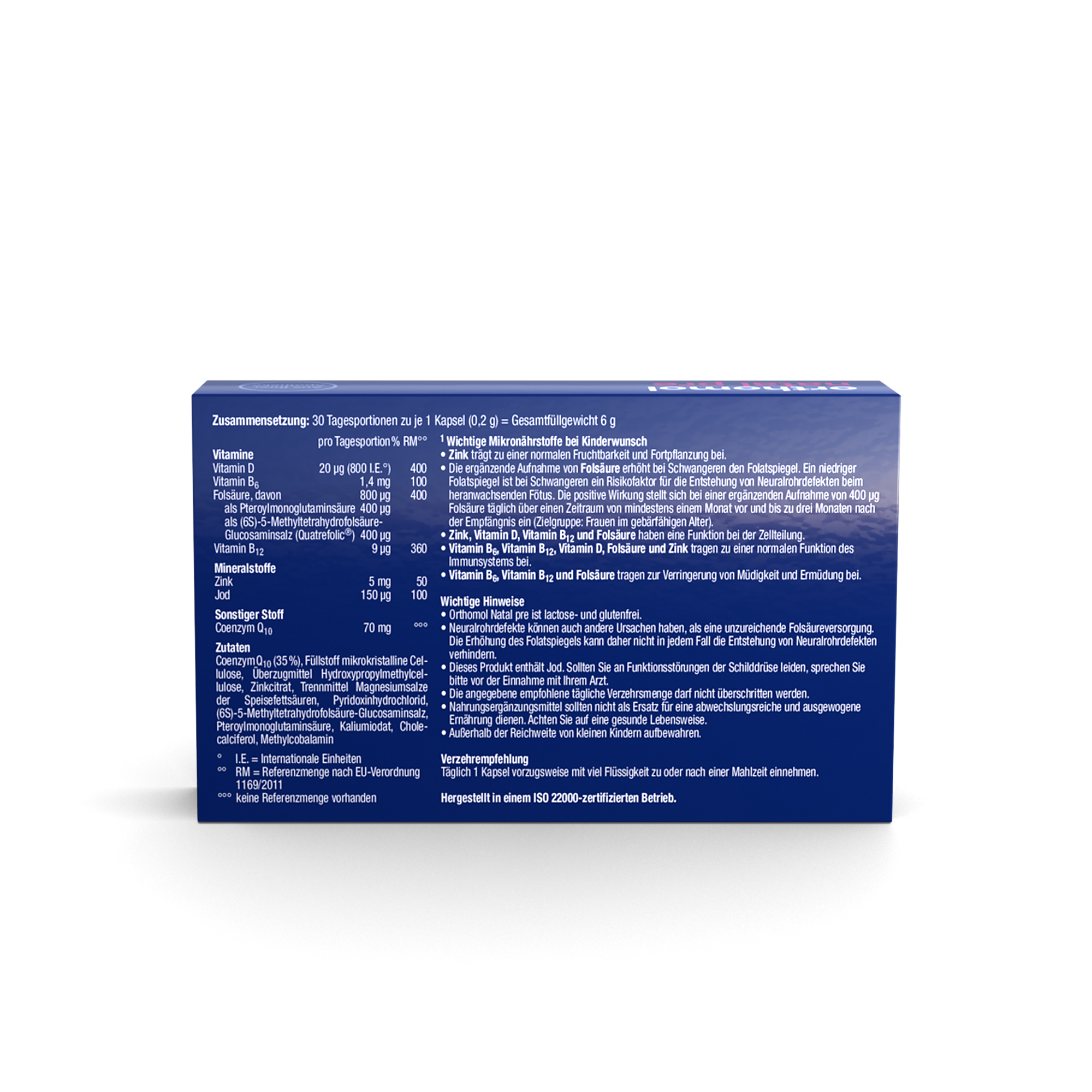 Coenzym Q10 (35%), Füllstoff mikrokristalline Cellulose, Überzugmittel Hydroxypropylmethylcellulose, Zinkcitrat, Trennmittel Magnesiumsalze der Speisefettsäuren, Pyridoxinhydrochlorid, (6S)-5-Methyltetrahydrofolsäure-Glucosaminsalz, Pteroylmonoglutaminsäure, Kaliumiodat, Cholecalciferol, Methylcobalamin