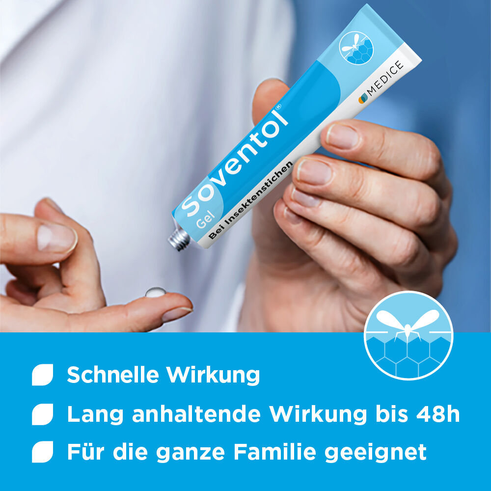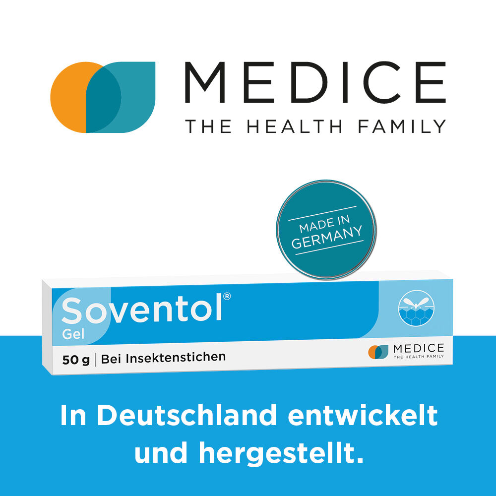 Bei Insektenstichen ist Soventol® Gel ein echter Klassiker für die ganze Familie! Es nimmt die Rötung und lindert den Juckreiz – schnell und langanhaltend zugleich. Denn nur Soventol® Gel enthält das Antihistaminikum Bamipin, das für seinen schnellen Wirkeintritt und den langen Wirkeffekt bekannt ist. Dies wurde in unterschiedlichen Studien bereits mehrfach gezeigt. Dank der sehr guten Verträglichkeit ist Soventol® Gel bereits für Kleinkinder geeignet.